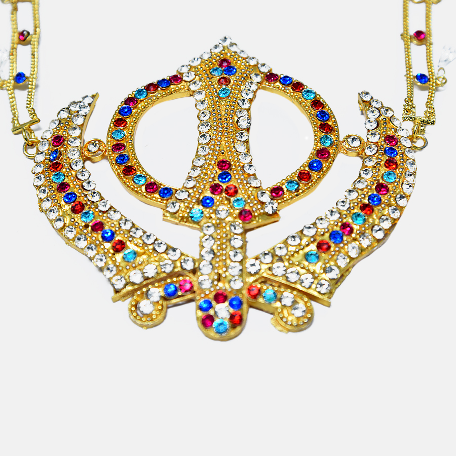 The Khanda is a revered Sikh symbol, and this gorgeous necklace from Sikh Essentials just adds to its significance. Multicolored diamonds, white beads, and brass chains make up this gorgeous necklace. It is usually used for Palki Sahib in Gurudwaras.