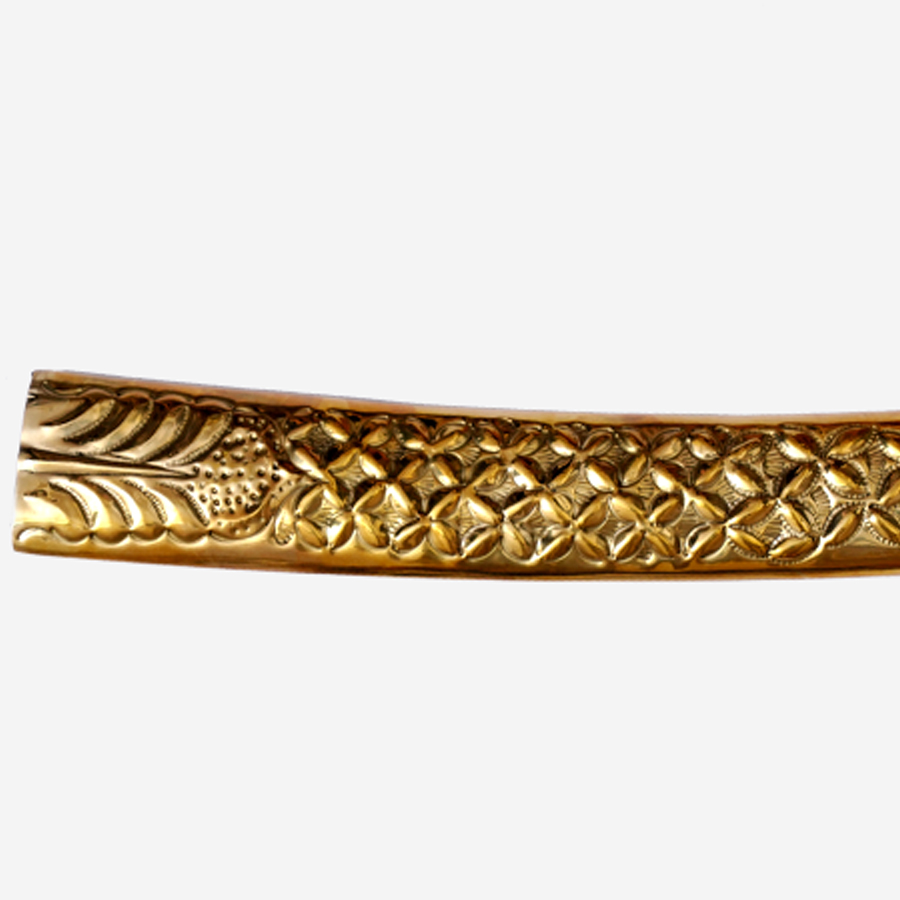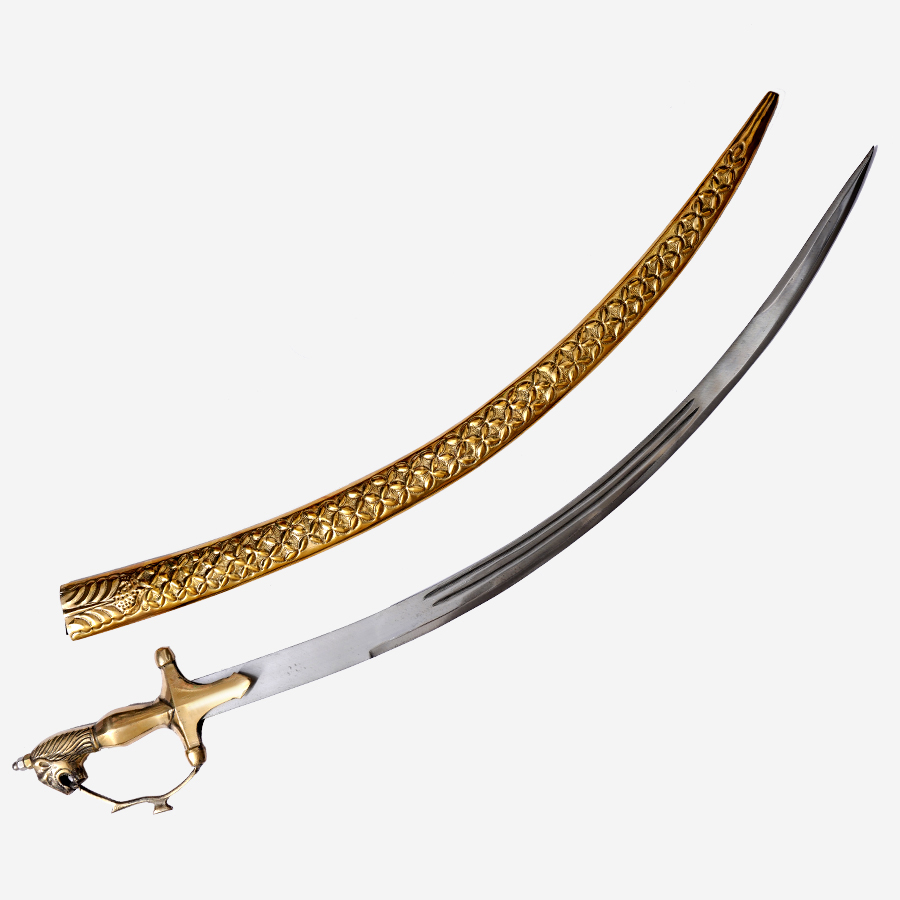 The 36 inches long fully golden Kirpan aka sword (talwaar), weighs approximately 1000 grams. Kamani, which is a type of iron, is used in it. The blade is unsharp, fitted with a stainless brass hilt with hunting lion carvings. The sheath is designed with heavy work of brass. It cannot be used as a weapon. An amazing buy for a kirpan fascinated person. The kirpans are also used as a ritual to keep in front of Sri Guru Granth Sahib Ji Prakash in every Gurudwara Sahib, across the world.