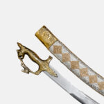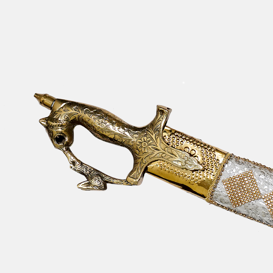 Sikh Essential Kirpan comes with an unsharpened blade and is made from stainless steel. It has gold metal art on top of its sheath, and a horse face is carved onto the hilt. Decorative golden motifs are woven into the silver cloth covering its sheath, creating a beautiful combination. In Indian wedding ceremonies, the kirpan plays an important role.