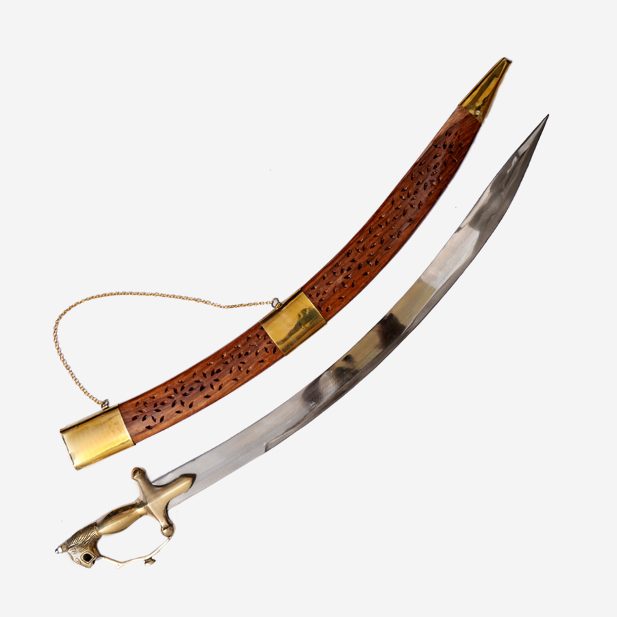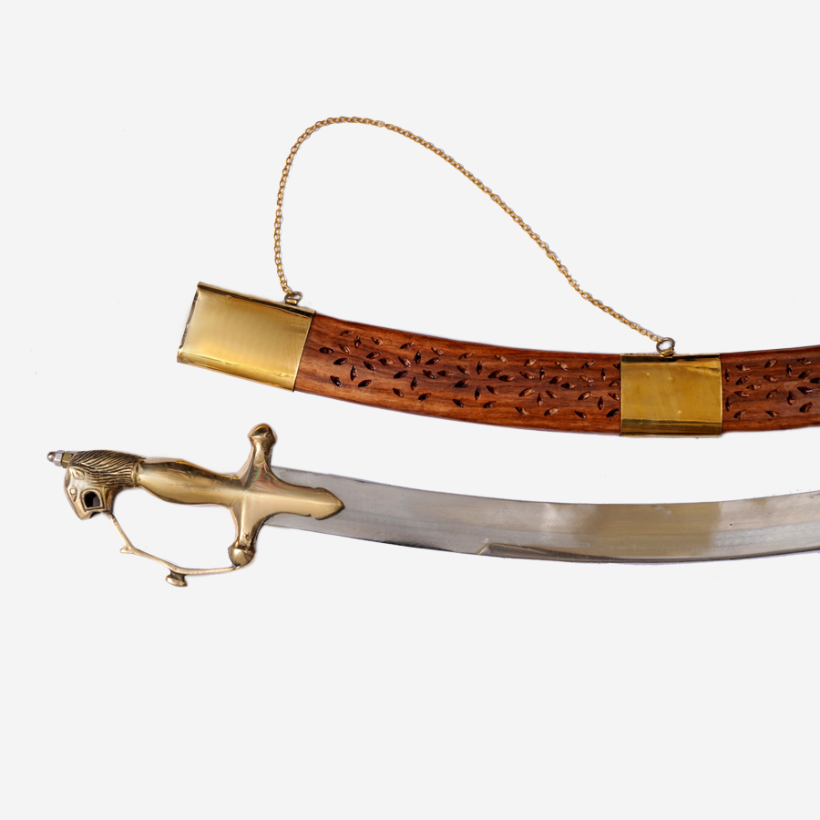 This kirpan is 36 inches long. It has a pretty designed wooden sheath. It is made with the Kamani type of iron, having an unsharp blade. The brass hilt of the kirpan has a hunting lion carving on it and a side brass chain. The word ‘kirpan” comes from two Punjabi words: ‘kirpa’ means an act of kindness, a favor; and ‘Aan’ means honor and self-respect. The carvings of a lion on the kirpan not only enrich the look but are most suitable to the meaning of kirpan. As lions are a symbol of a compassionate, strong, and dignified personality.