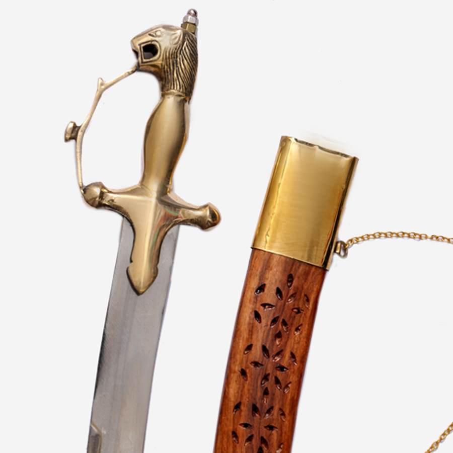 - Brass hilt with hunting lion carvings