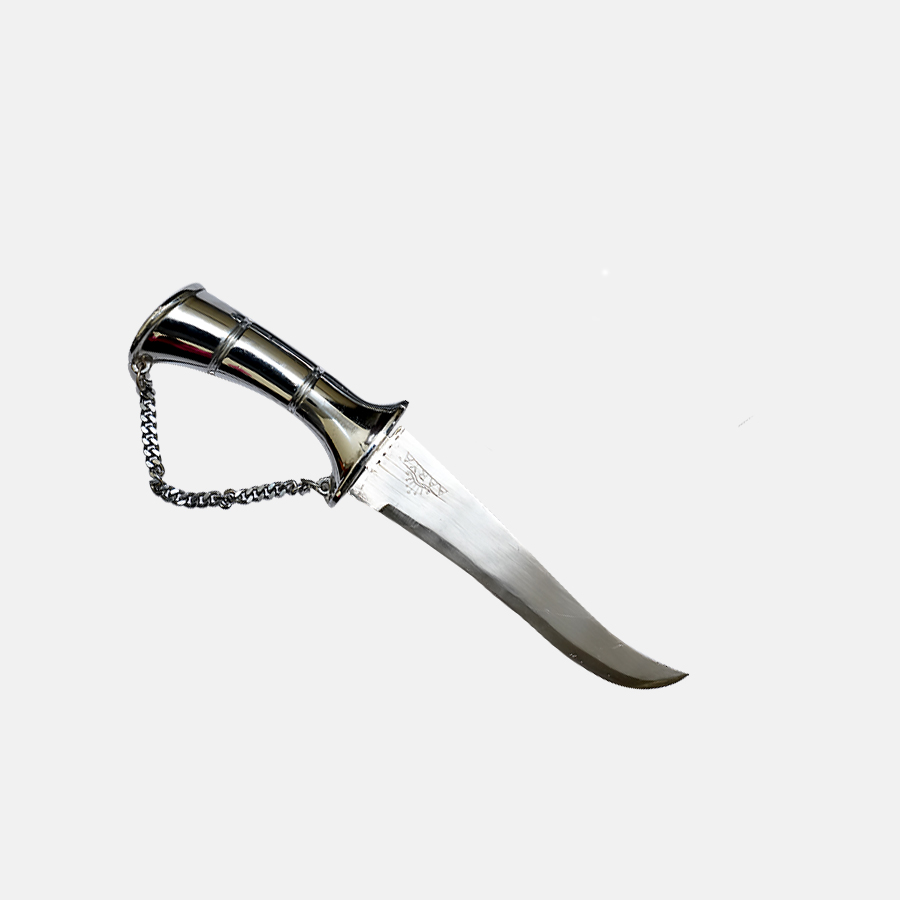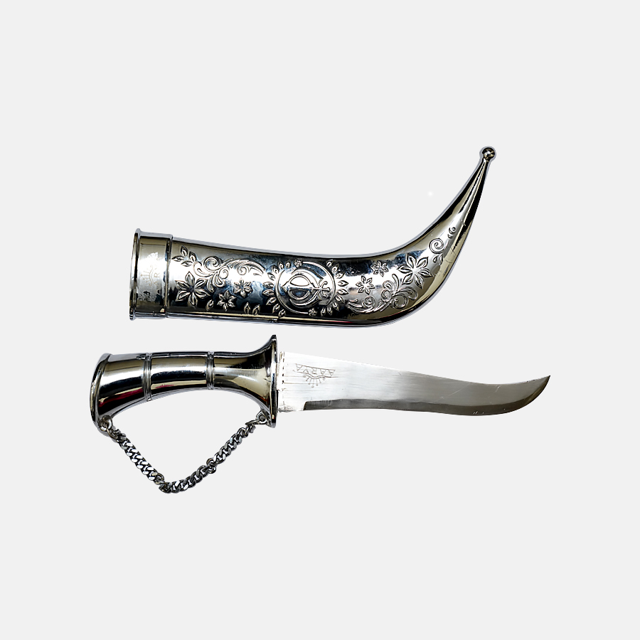 A simple, yet beautiful design, it features the Khanda symbol engraved on the sheath and a side brass chain. Made with kamani iron, it is not intended for use as a weapon since the blade is unsharpened.
