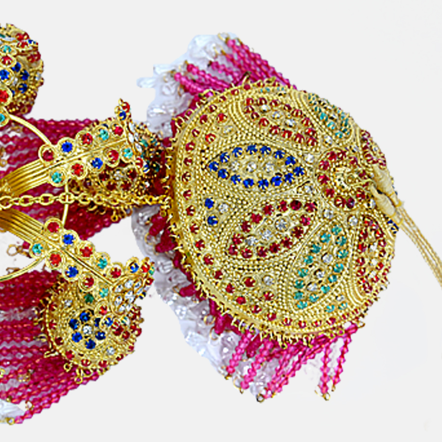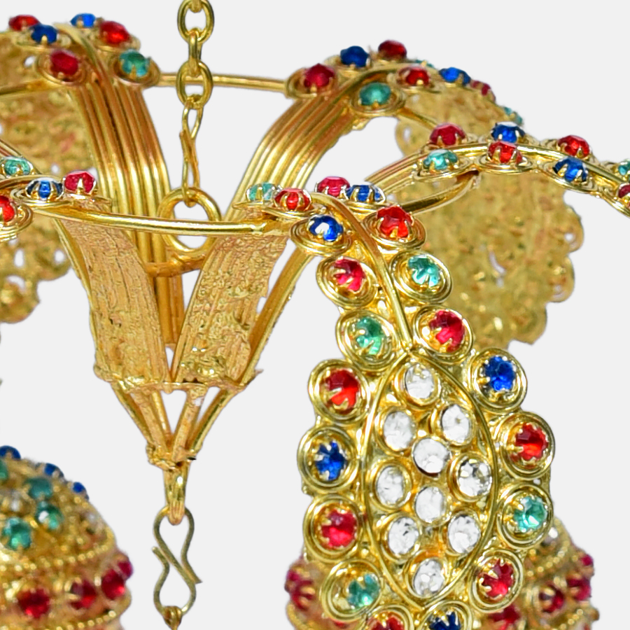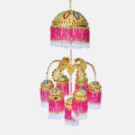Sikh Essentials’ Jhoomer / Chattar Sahib has a rich feel to it, and the multicoloured blend emanates grandeur. This magnificent work of art is created by the best Indian artisans. At the top, multicolor diamonds are engraved into a golden brass metal base, while pink and golden crystals hang down. It has a multilayer and is usually hung beneath the chandoa sahib. Six more little jhoomers are connected to the main Jhoomer in a pattern.