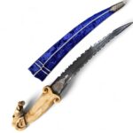 This Sikh Essential Kirpan is made of Damascus (iron alloy) with a silver wire inlay case. Indian Rajasthani Koftgiri work (silver wire inlay work) is an art form practiced by very few well-trained craftsmen. The hilt of this Kirpan is uniquely designed. Since the blade is not sharp, it cannot be used as a weapon.